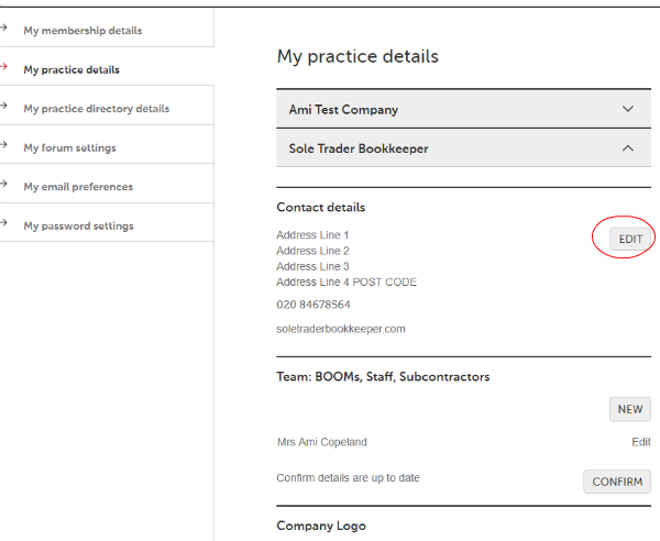 3. Check the company name and contact details for your practice and click EDIT if you need to make any changes. Please note you cannot change the company name online and should contact ICB directly if necessary.